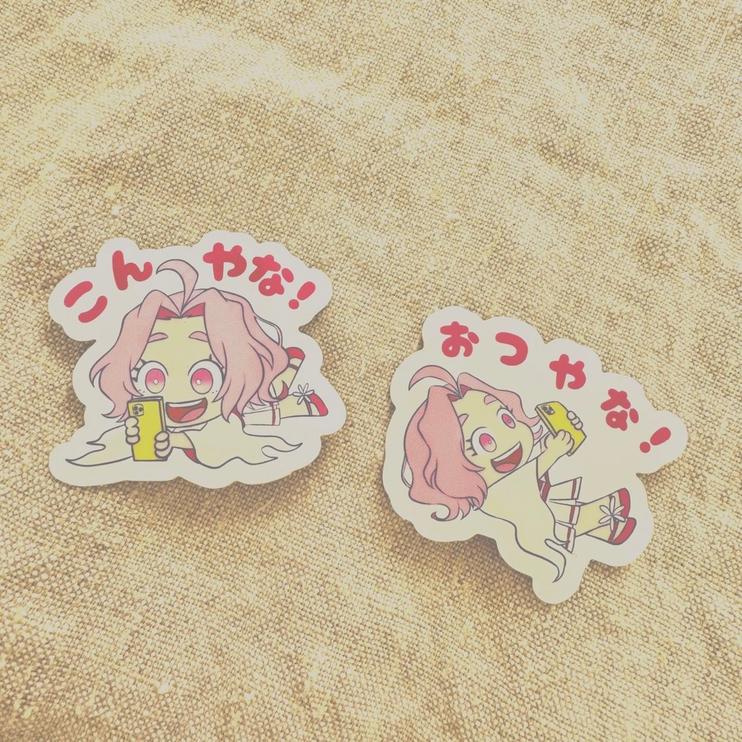 Ayana's greeting and farewell to stream chat, together in one set! Konyana and Otsuyana! 2"x2" vinyl stickers
